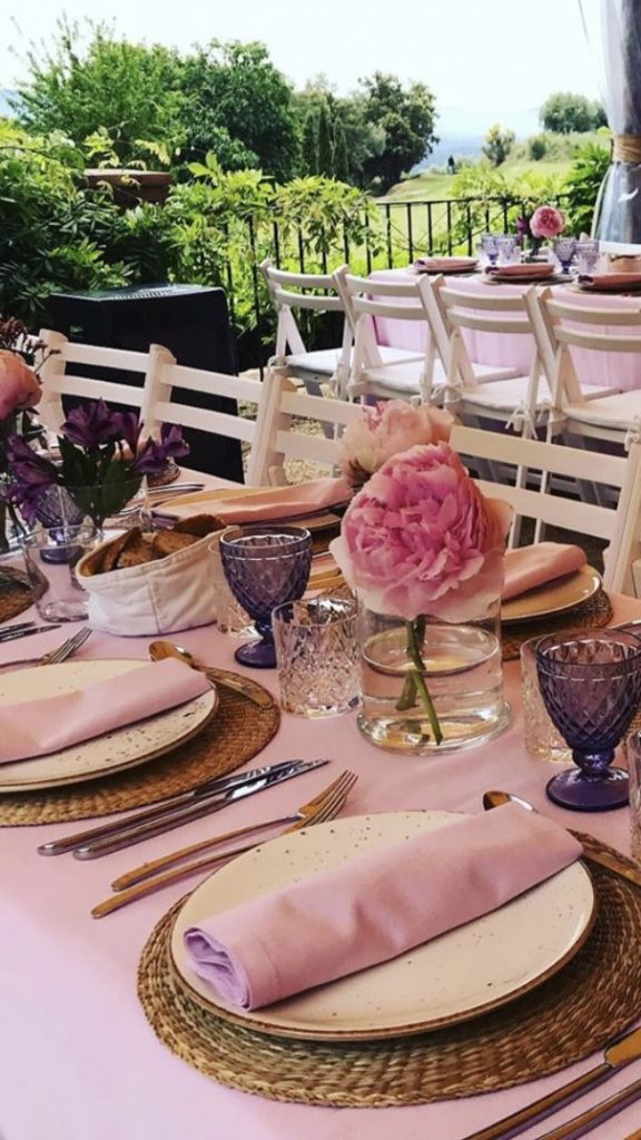 En las mesas, puedes jugar con texturas para dar profundidad. Mantelerías en gris roca como base, con caminos de mesa o servilletas en rosa palo, o al revés. La vajilla en tonos blancos o gris claro mantiene la elegancia sin competir con los colores principales.