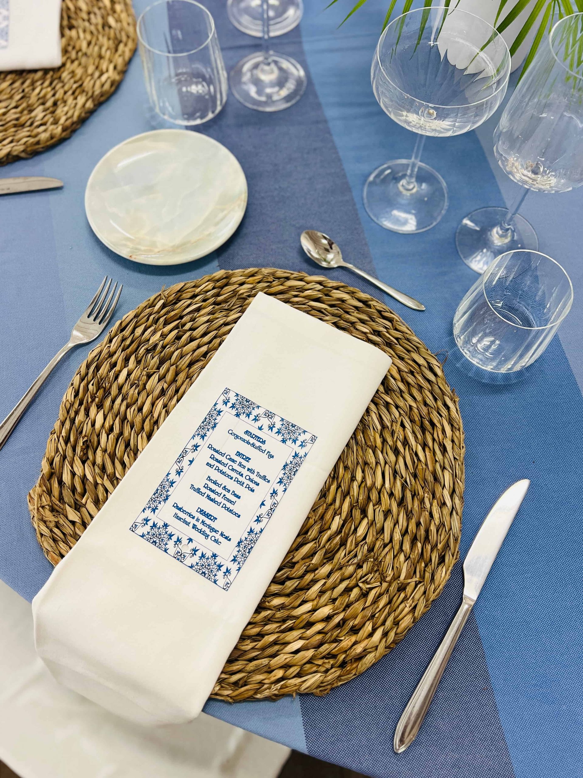 Los centros florales con hortensias azules, rosas blancas y pequeñas ramas de olivo quedan espectaculares. Si añades detalles dorados sutiles en las tarjetas de menú o los portavelas, elevas toda la composición a otro nivel. Esta paleta permite jugar con diferentes tonalidades de azul en los detalles sin perder coherencia.
